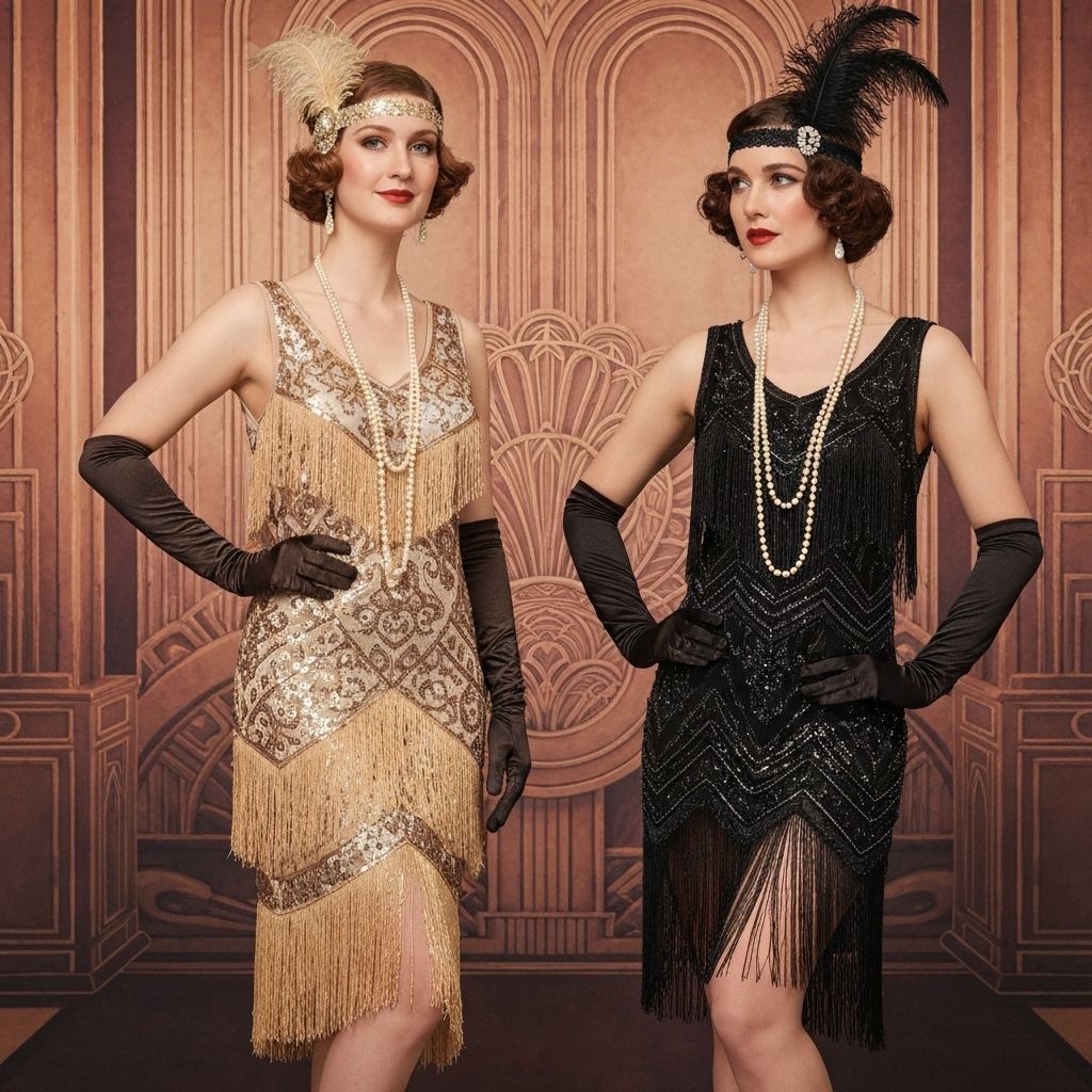 Воплотите дух ревущих двадцатых! Платья с бахромой, смокинги, перья, жемчуг - покажите свой неповторимый стиль и элегантность той эпохи.